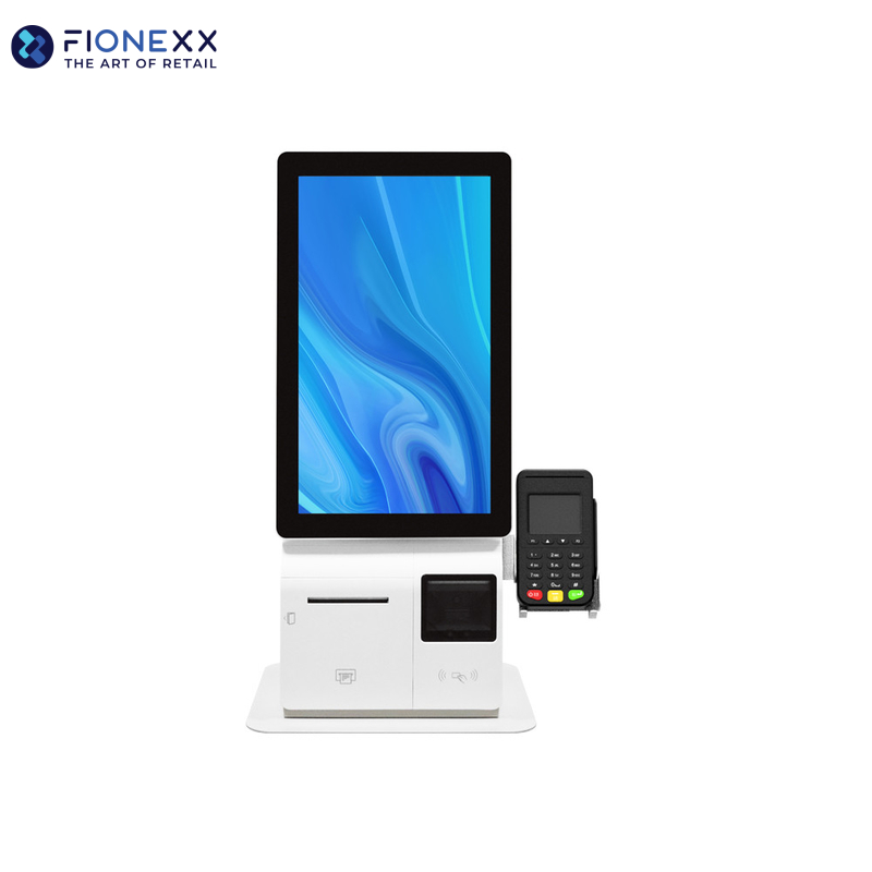 Self-service bestelkiosk, robuust en compact ontwerp ideaal voor restaurants en takeaways, met ingebouwde printer en snelle QR-scanner.